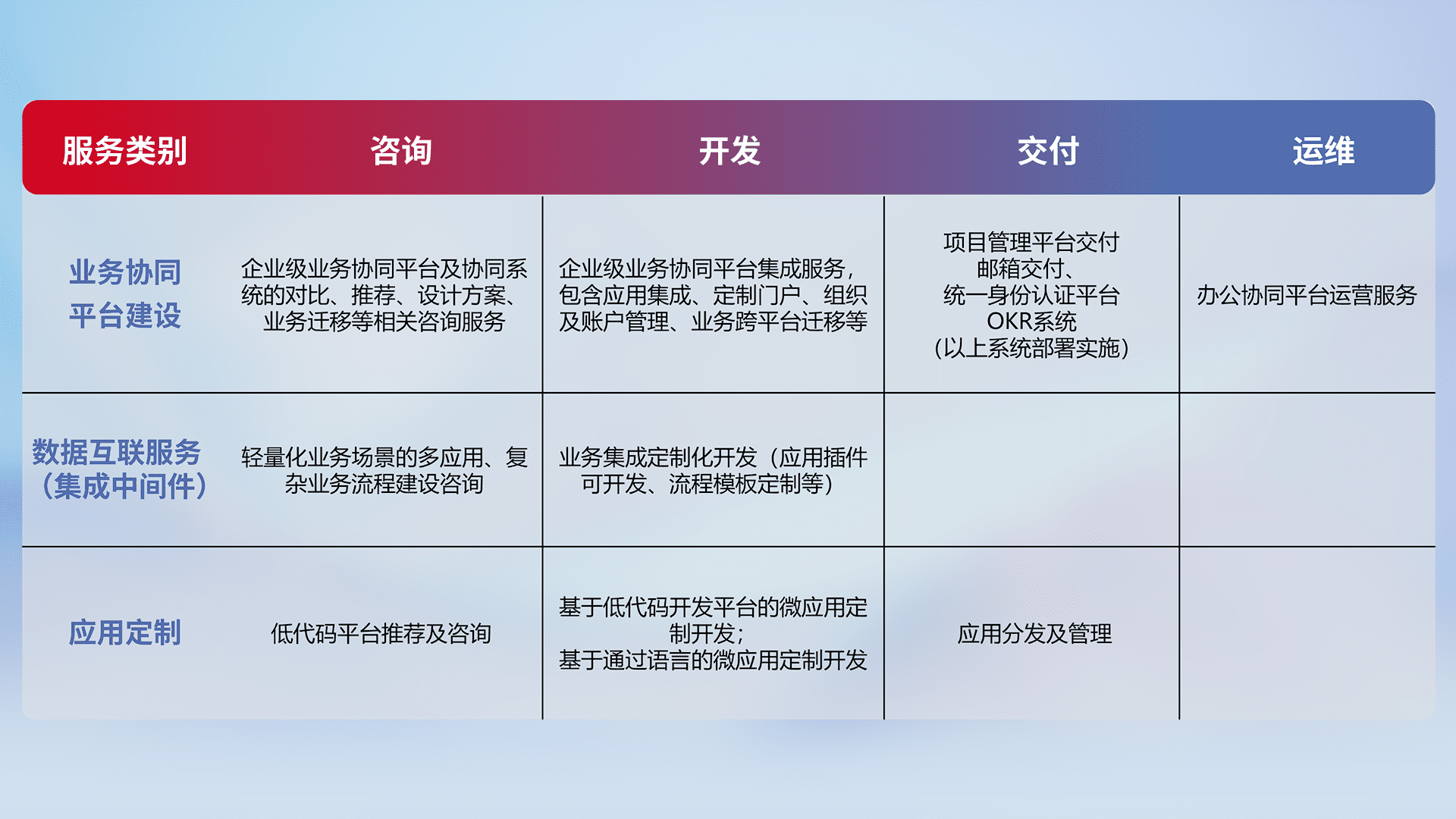 针对钉钉、、、企微、、、IDaas等平台级产品提供产品的规划、、、方案、、、交付、、、、定制化开发等服务,,,,实现如统一协同办公、、、、智能客户服务、、、混合会议管理、、、智能数据查询、、等业务场景,,实现数字化转型。。。